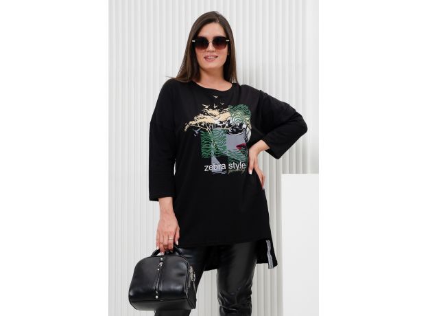 Туника женская. На полочке принт. По низу изделия отделка тесьма.