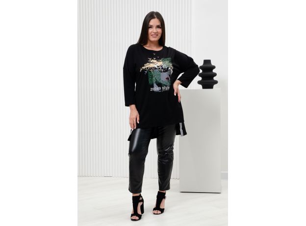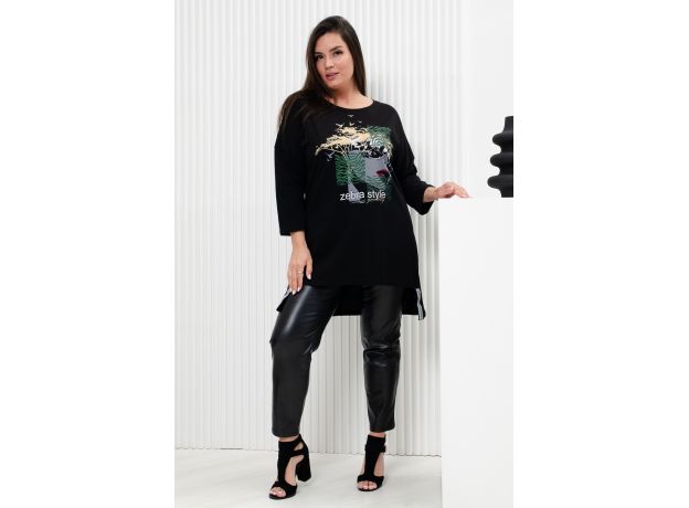 Туника женская. На полочке принт. По низу изделия отделка тесьма.