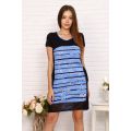 Туника полуприлегающего силуэта, с боковыми карманами, средней длины, с V-образной горловиной. Рукав втачной, короткий, из отделочного полотна, со вставкой из сетки. Полочка с кокеткой и лампасами из отделочного полотна. В нижней части полочки расположена вставка из сетки. На спинке обработан фигурный вырез с декоративными завязками, кокетки из отделочного полотна. Горловина, низ рукавов и фигурный вырез на спинке обработаны бейкой.