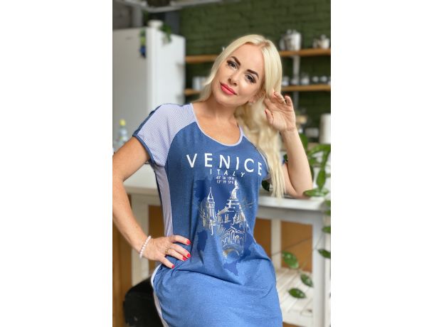 Туника полуприлегающего силуэта, с округлой горловиной, с боковыми карманами. Рукав короткий, реглан, с лампасом из основного полотна. По боковым швам расположены вставки из отделочного полотна. Горловина и рукава обработаны бейкой.