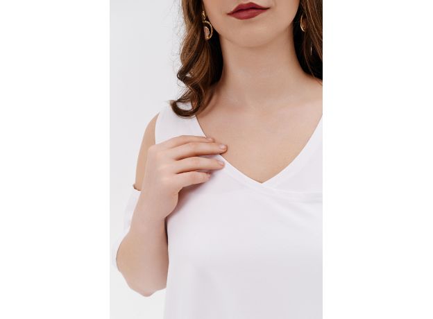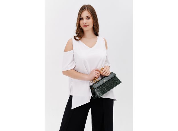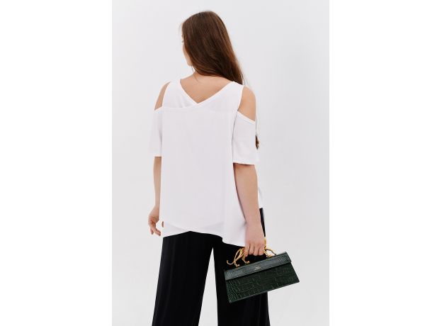 Дизайнерская женская блузка свободного кроя. Её можно носить как вечернюю или офисную, так же подойдет для жаркой погоды. Модель выполнена из приятной на ощупь дышащей ткани, не просвечивает. Особенностью блузки являются двойные полочка и спинка. Рукав с открытым плечом.