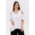 Дизайнерская женская блузка свободного кроя. Её можно носить как вечернюю или офисную, так же подойдет для жаркой погоды. Модель выполнена из приятной на ощупь дышащей ткани, не просвечивает. Особенностью блузки являются двойные полочка и спинка. Рукав с открытым плечом.