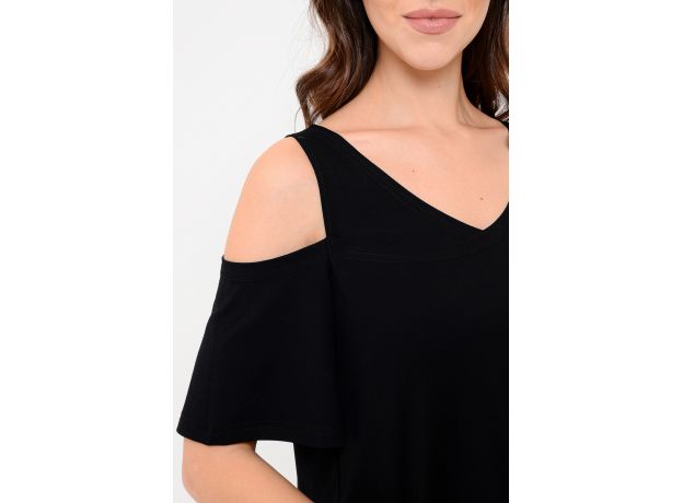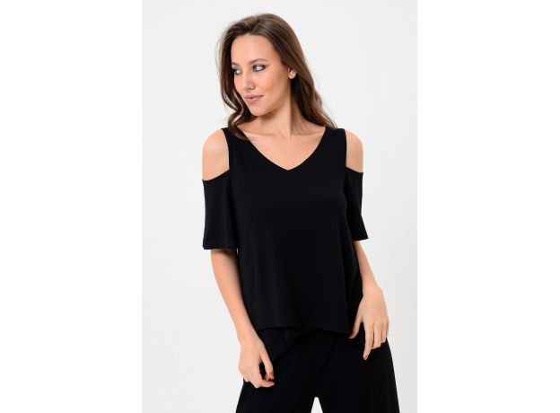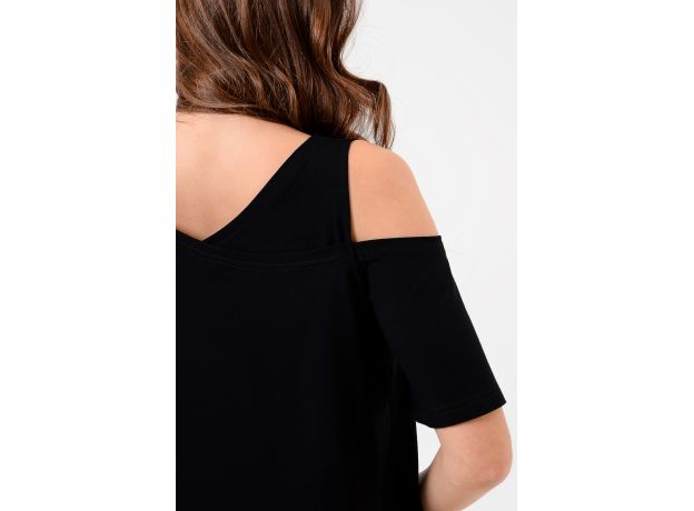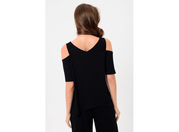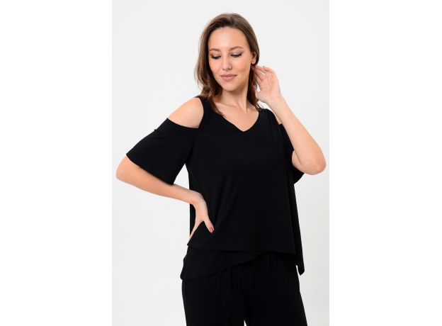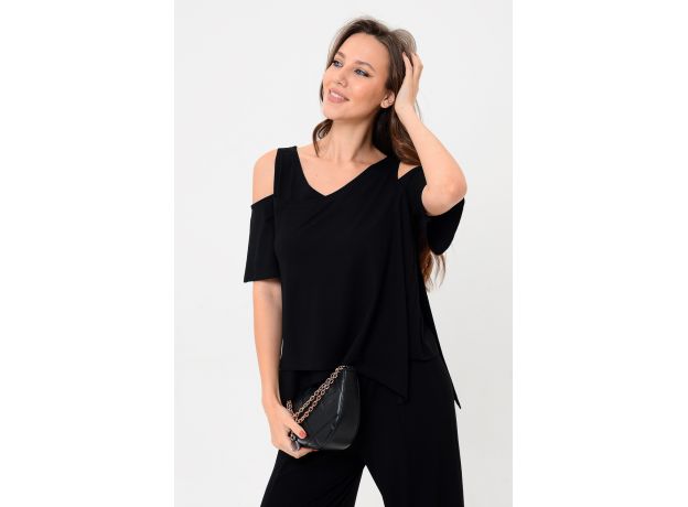 Дизайнерская женская блузка свободного кроя. Её можно носить как вечернюю или офисную, так же подойдет для жаркой погоды. Модель выполнена из приятной на ощупь дышащей ткани, не просвечивает. Особенностью блузки являются двойные полочка и спинка. Рукав с открытым плечом.
