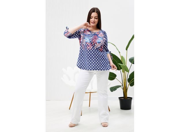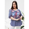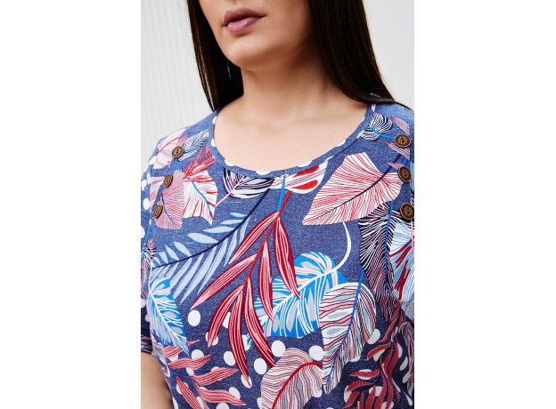 Туника женская свободного силуэта. На полочке застроченные вертикальные складки, декорированные пуговицами. Рукав 3/4; с завязками.
