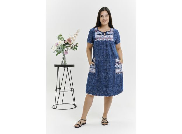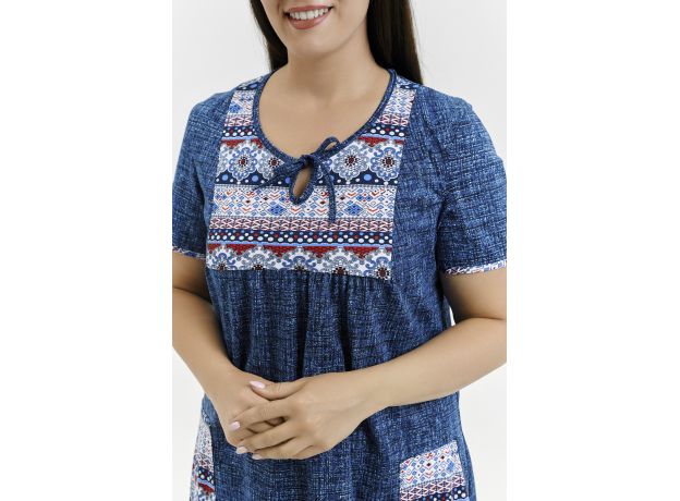 Стильная женская туника из кулирки. Горловина с завязками, короткие рукава, узорчатые вставки, карманы и окантовка, общая длина туники чуть выше коленей.