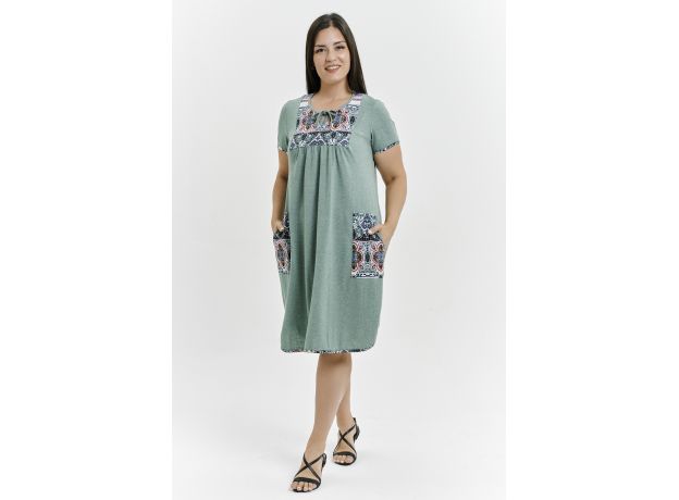Стильная женская туника из кулирки. Горловина с завязками, короткие рукава, узорчатые вставки, карманы и окантовка, общая длина туники чуть выше коленей.