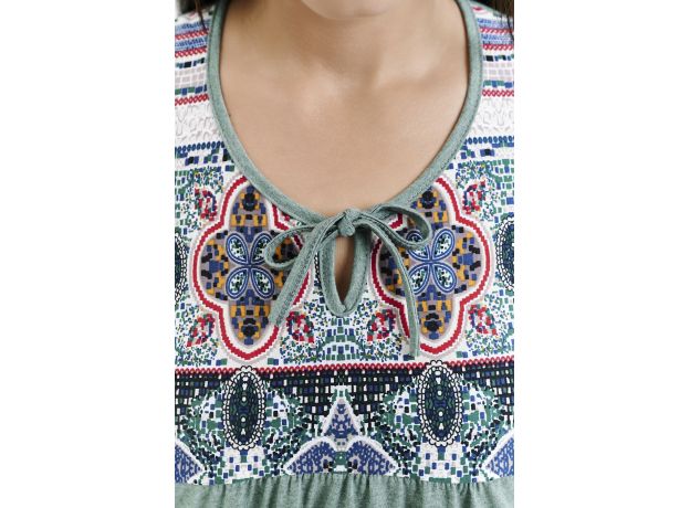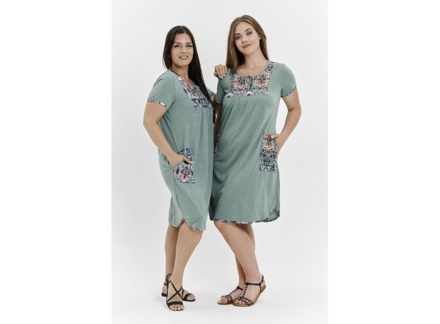 Стильная женская туника из кулирки. Горловина с завязками, короткие рукава, узорчатые вставки, карманы и окантовка, общая длина туники чуть выше коленей.