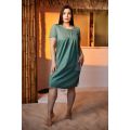 Стильная женская туника из кулирки. Горловина с завязками, короткие рукава, узорчатые вставки, карманы и окантовка, общая длина туники чуть выше коленей.