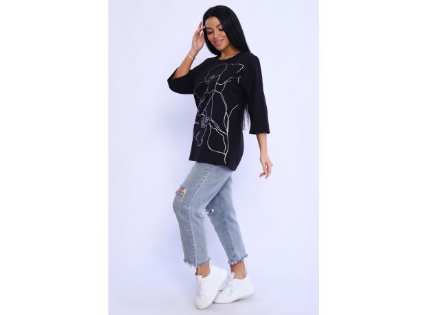 Туника из натурального хлопка прекрасный вариант для повседневного образа. Будет комфортна и как базовый вариант к классическим брючкам, так и к стилю спортшик. Принт в виде большого цветка лилии с использованием глиттера и техники объёмной печати украшает модель, придавая ей изысканный вид. Обработка деталей вкруговую с закрепкой, рукав длиной 3/4, горловина втачная из основной ткани. Большие размеры!