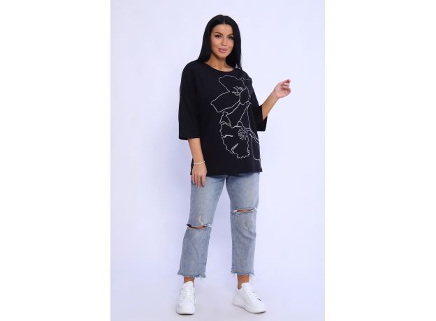 Туника из натурального хлопка прекрасный вариант для повседневного образа. Будет комфортна и как базовый вариант к классическим брючкам, так и к стилю спортшик. Принт в виде большого цветка лилии с использованием глиттера и техники объёмной печати украшает модель, придавая ей изысканный вид. Обработка деталей вкруговую с закрепкой, рукав длиной 3/4, горловина втачная из основной ткани. Большие размеры!