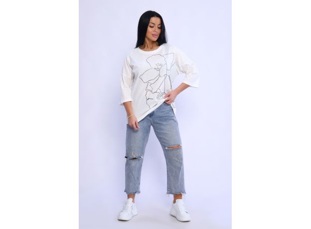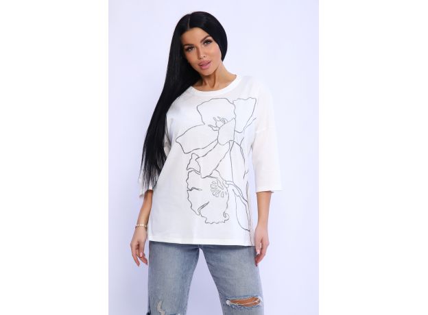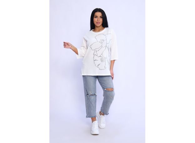 Туника из натурального хлопка прекрасный вариант для повседневного образа. Будет комфортна и как базовый вариант к классическим брючкам, так и к стилю спортшик. Принт в виде большого цветка лилии с использованием глиттера и техники объёмной печати украшает модель, придавая ей изысканный вид. Обработка деталей вкруговую с закрепкой, рукав длиной 3/4, горловина втачная из основной ткани. Большие размеры!