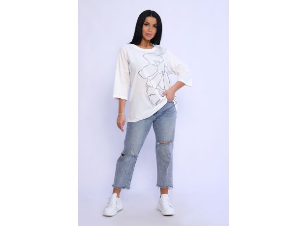 Туника из натурального хлопка прекрасный вариант для повседневного образа. Будет комфортна и как базовый вариант к классическим брючкам, так и к стилю спортшик. Принт в виде большого цветка лилии с использованием глиттера и техники объёмной печати украшает модель, придавая ей изысканный вид. Обработка деталей вкруговую с закрепкой, рукав длиной 3/4, горловина втачная из основной ткани. Большие размеры!
