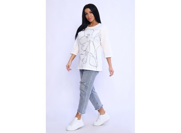 Туника из натурального хлопка прекрасный вариант для повседневного образа. Будет комфортна и как базовый вариант к классическим брючкам, так и к стилю спортшик. Принт в виде большого цветка лилии с использованием глиттера и техники объёмной печати украшает модель, придавая ей изысканный вид. Обработка деталей вкруговую с закрепкой, рукав длиной 3/4, горловина втачная из основной ткани. Большие размеры!