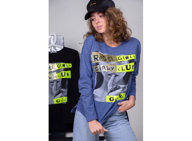 Туника полуприталенного силуэта, с удлиненной спинкой, с округлой горловиной. Рукав длинный. В нижней части боковых швов обработаны разрезы. Горловина обработана бейкой из основного полотна. Полочку украшает яркая печать с пайетками.