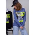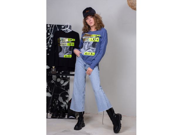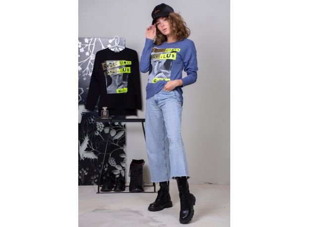 Туника полуприталенного силуэта, с удлиненной спинкой, с округлой горловиной. Рукав длинный. В нижней части боковых швов обработаны разрезы. Горловина обработана бейкой из основного полотна. Полочку украшает яркая печать с пайетками.