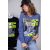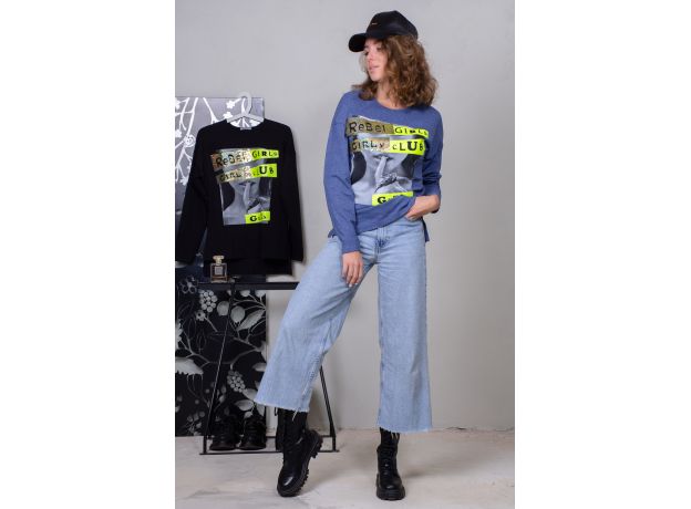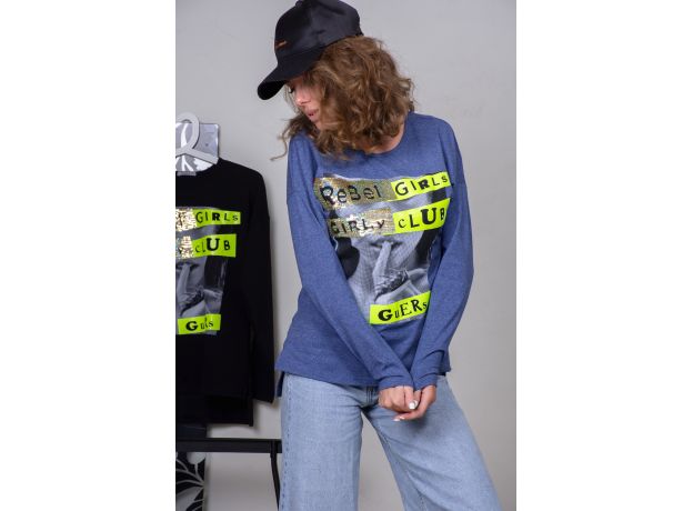 Туника полуприталенного силуэта, с удлиненной спинкой, с округлой горловиной. Рукав длинный. В нижней части боковых швов обработаны разрезы. Горловина обработана бейкой из основного полотна. Полочку украшает яркая печать с пайетками.