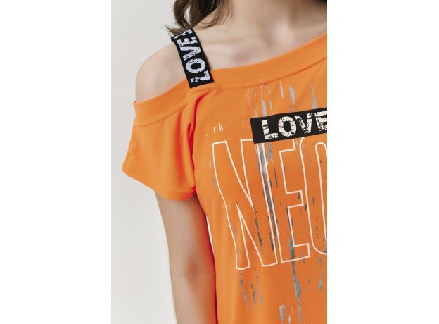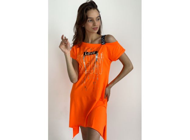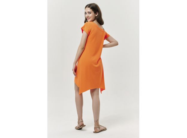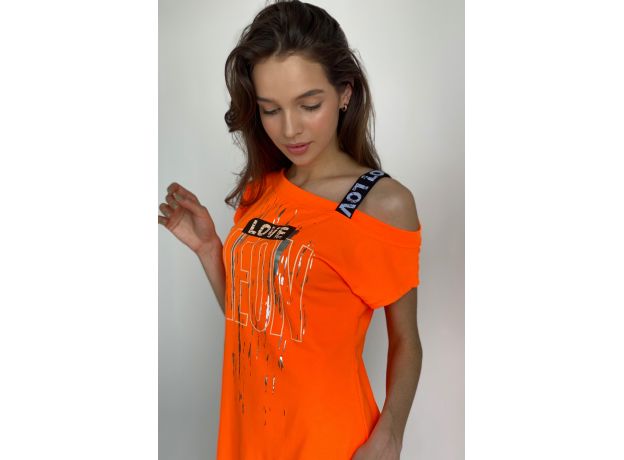 Туника полуприлегающего силуэта, длиной выше колена спереди и удлиненной спинкой сзади, с фигурной линией низа. Рукав цельнокроеный, короткий. В нижней части боковых швов обработаны разрезы. Горловина асимметричная с эластичной бретелью, обработана обтачкой из основного полотна.