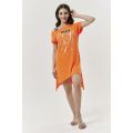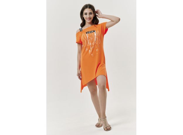 Туника полуприлегающего силуэта, длиной выше колена спереди и удлиненной спинкой сзади, с фигурной линией низа. Рукав цельнокроеный, короткий. В нижней части боковых швов обработаны разрезы. Горловина асимметричная с эластичной бретелью, обработана обтачкой из основного полотна.