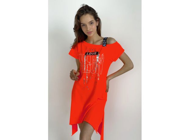 Туника полуприлегающего силуэта, длиной выше колена спереди и удлиненной спинкой сзади, с фигурной линией низа. Рукав цельнокроеный, короткий. В нижней части боковых швов обработаны разрезы. Горловина асимметричная с эластичной бретелью, обработана обтачкой из основного полотна.