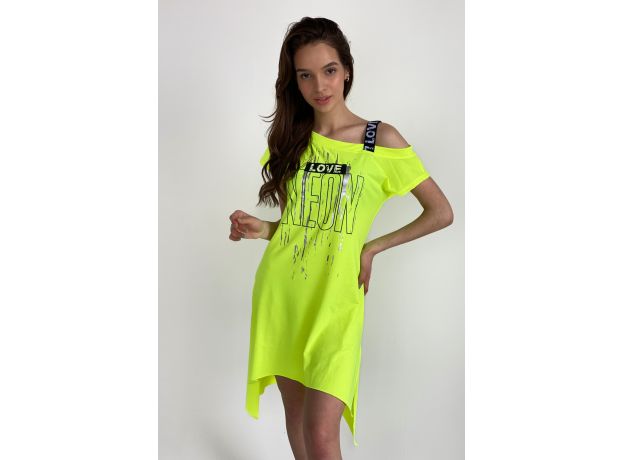 Туника полуприлегающего силуэта, длиной выше колена спереди и удлиненной спинкой сзади, с фигурной линией низа. Рукав цельнокроеный, короткий. В нижней части боковых швов обработаны разрезы. Горловина асимметричная с эластичной бретелью, обработана обтачкой из основного полотна.