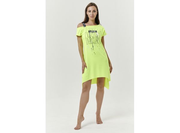 Туника полуприлегающего силуэта, длиной выше колена спереди и удлиненной спинкой сзади, с фигурной линией низа. Рукав цельнокроеный, короткий. В нижней части боковых швов обработаны разрезы. Горловина асимметричная с эластичной бретелью, обработана обтачкой из основного полотна.