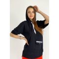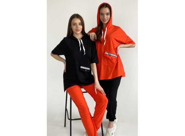 Туника прямая, свободная, с капюшоном, с удлиненной спинкой. Рукав короткий. На полочке расположен накладной карман с клапаном. В нижней части боковых швов обработаны разрезы.