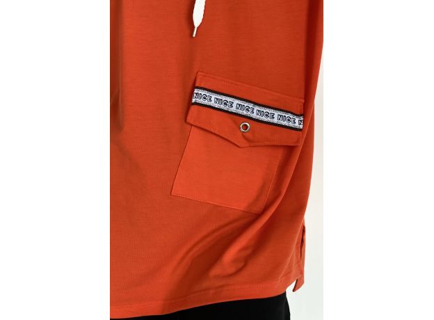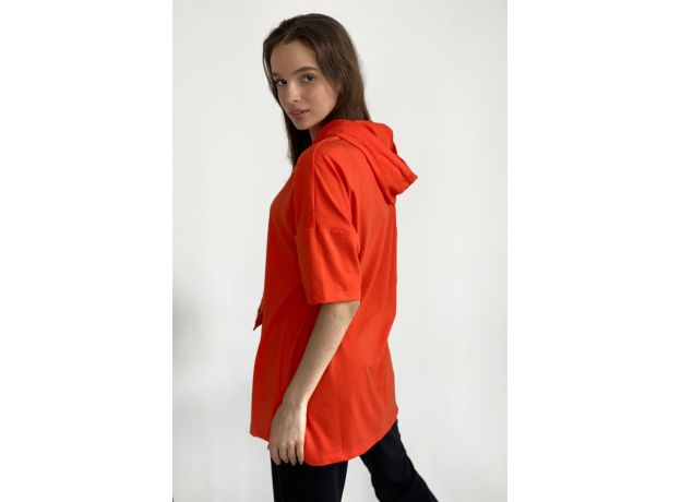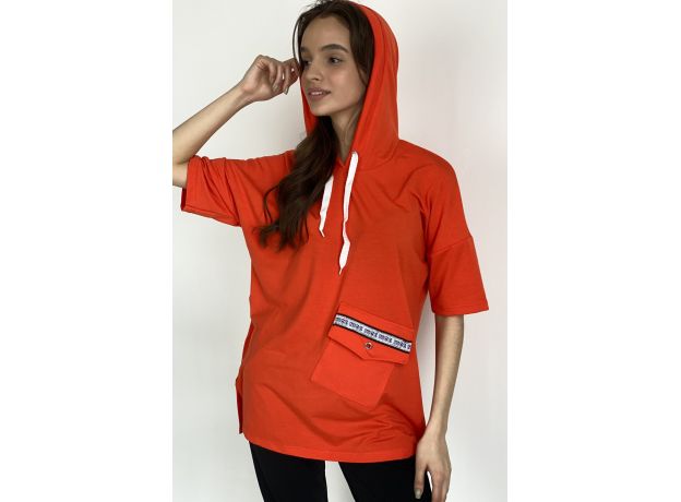 Туника прямая, свободная, с капюшоном, с удлиненной спинкой. Рукав короткий. На полочке расположен накладной карман с клапаном. В нижней части боковых швов обработаны разрезы.