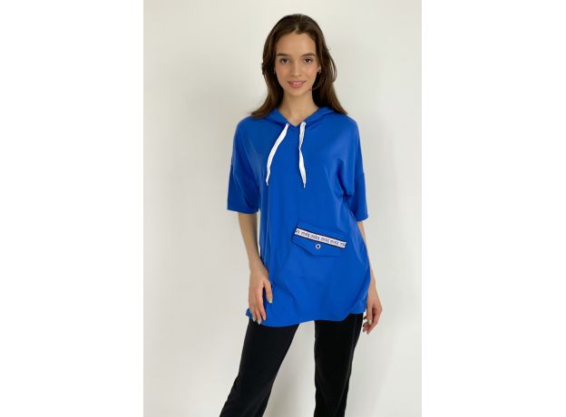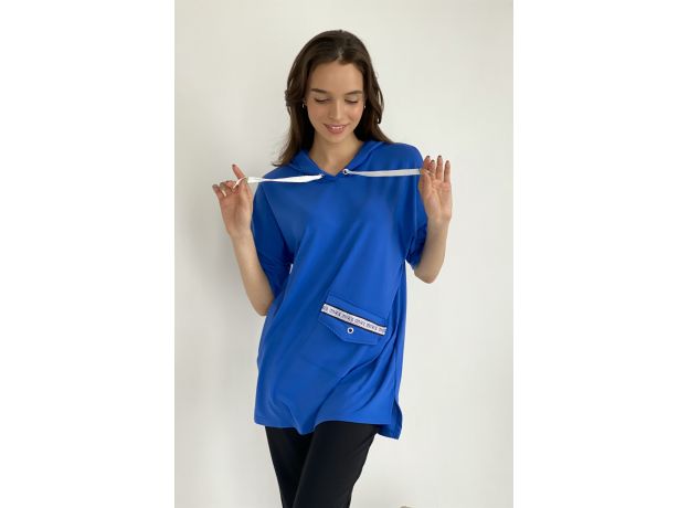 Туника прямая, свободная, с капюшоном, с удлиненной спинкой. Рукав короткий. На полочке расположен накладной карман с клапаном. В нижней части боковых швов обработаны разрезы.