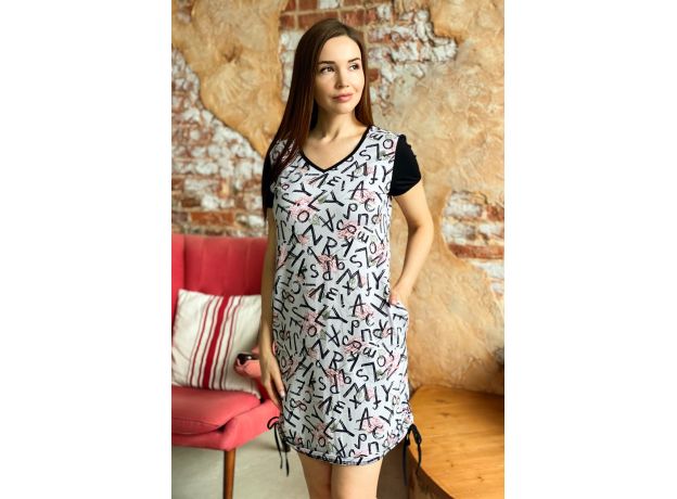 Туника полуприлегающего силуэта, с боковыми карманами, средней длины, с V-образной горловиной. Рукав втачной. На спинке расположена кокетка из отделочного полотна. В нижней части боковых швов обработаны разрезы со шнурами-стяжками. Горловина и низ рукавов обработаны бейкой из отделочного полотна.