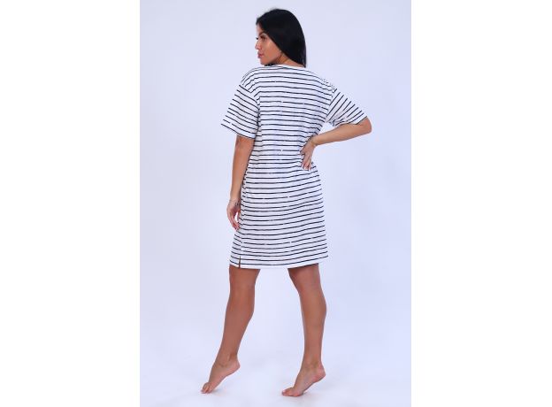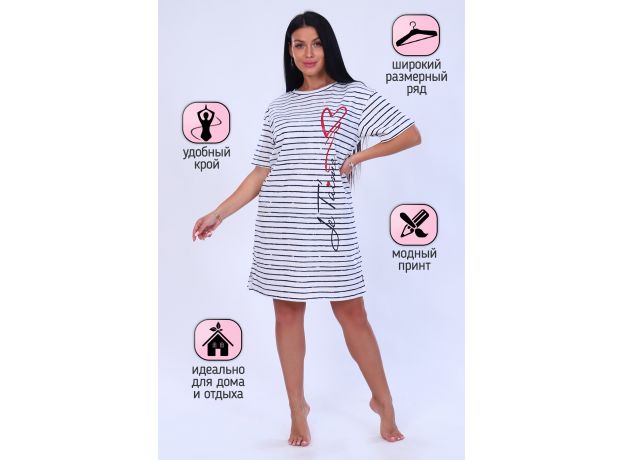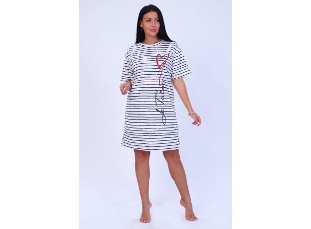 Туника женская из трикотажного полотна с набивным рисунком, полуприлегающего силуэта. На полочке расположен принт. Горловина округлой форма, обработана обтачкой. Рукав короткий, цельнокроеный. Низ изделия и рукавов подогнут.