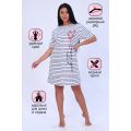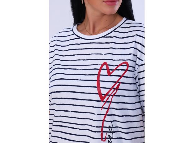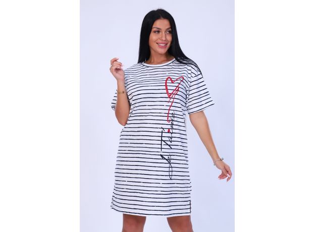 Туника женская из трикотажного полотна с набивным рисунком, полуприлегающего силуэта. На полочке расположен принт. Горловина округлой форма, обработана обтачкой. Рукав короткий, цельнокроеный. Низ изделия и рукавов подогнут.