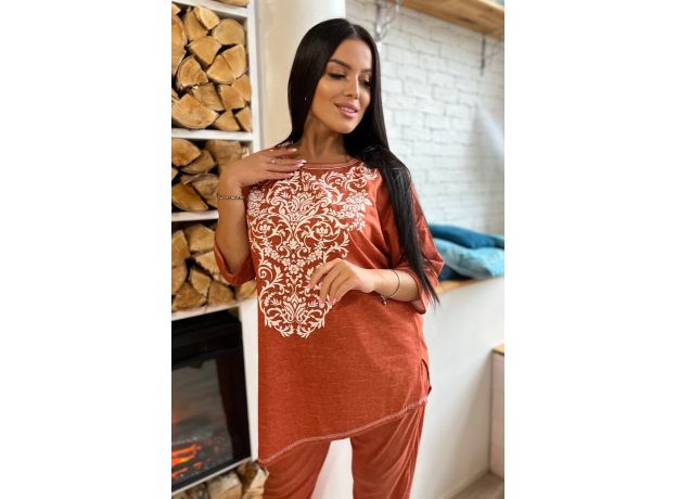 Туника прямая, свободная, с округлой горловиной, с асимметричным низом. Рукав длиной 3/4. Горловина обработана бейкой из основного полотна.