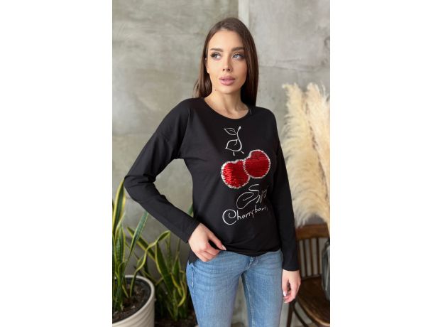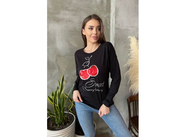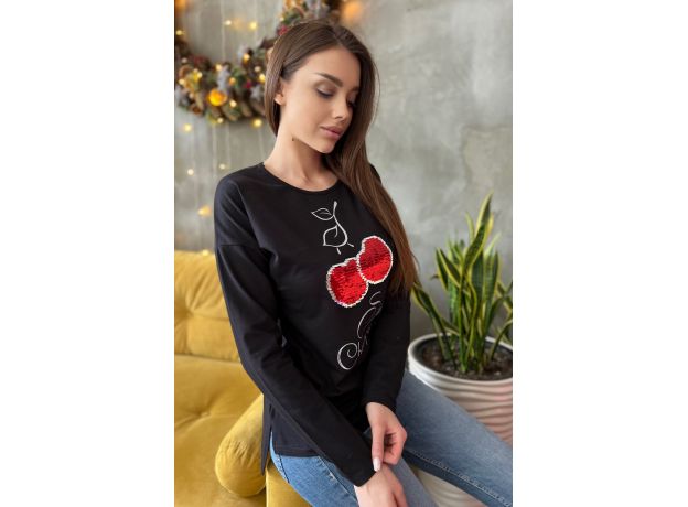 Туника полуприталенного силуэта, с удлиненной спинкой, с округлой горловиной. Рукав длинный. В нижней части боковых швов обработаны разрезы. Горловина обработана бейкой из основного полотна. На полочке эффектная аппликация из пайеток и печать