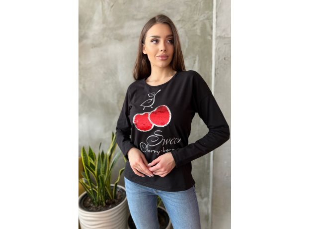 Туника полуприталенного силуэта, с удлиненной спинкой, с округлой горловиной. Рукав длинный. В нижней части боковых швов обработаны разрезы. Горловина обработана бейкой из основного полотна. На полочке эффектная аппликация из пайеток и печать