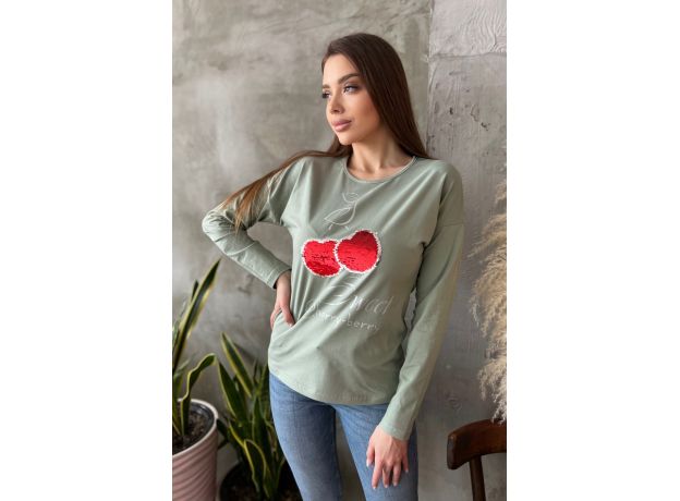 Туника полуприталенного силуэта, с удлиненной спинкой, с округлой горловиной. Рукав длинный. В нижней части боковых швов обработаны разрезы. Горловина обработана бейкой из основного полотна. На полочке эффектная аппликация из пайеток и печать