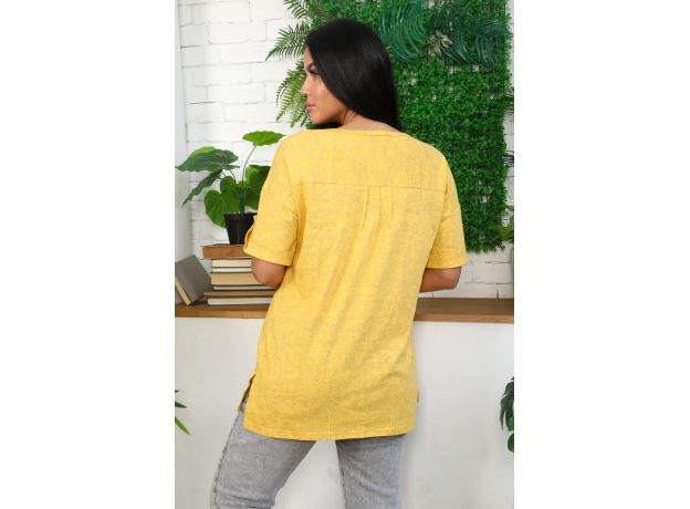Туника прямая, свободная, с округлой горловиной, с удлиненной спинкой. Рукав короткий, с манжетом и хлястом с пуговицей. В верхней части полочки обработаны декоративные защипы. Спинка с кокеткой. В нижней части боковых швов расположены разрезы. Горловина обработана бейкой из основного полотна.