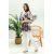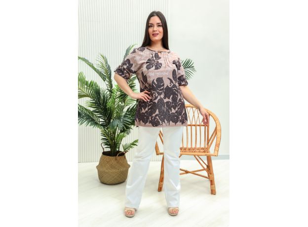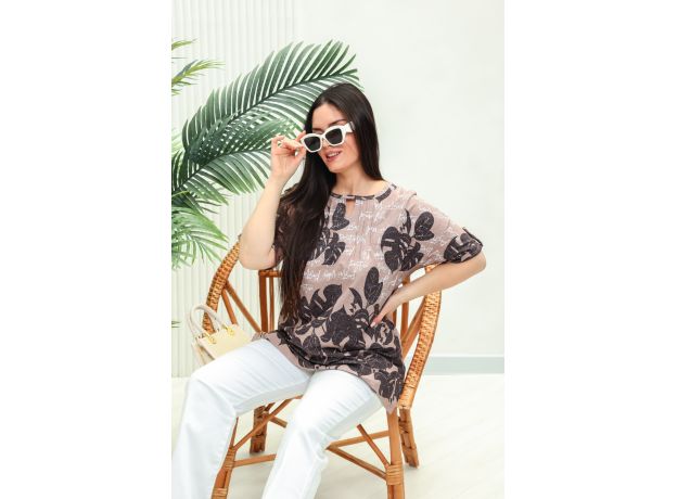 Туника прямая, свободная, с округлой горловиной, с удлиненной спинкой. Рукав короткий, с манжетом и хлястом с пуговицей. В верхней части полочки обработаны декоративные защипы. Спинка с кокеткой. В нижней части боковых швов расположены разрезы. Горловина обработана бейкой из основного полотна.