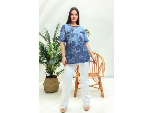 Туника прямая, свободная, с округлой горловиной, с удлиненной спинкой. Рукав короткий, с манжетом и хлястом с пуговицей. В верхней части полочки обработаны декоративные защипы. Спинка с кокеткой. В нижней части боковых швов расположены разрезы. Горловина обработана бейкой из основного полотна.
