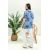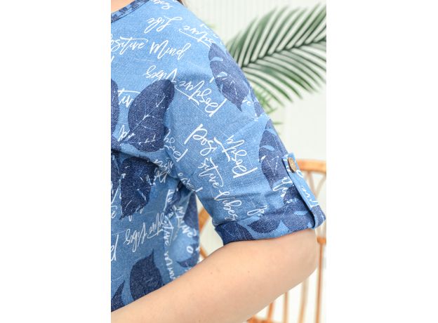 Туника прямая, свободная, с округлой горловиной, с удлиненной спинкой. Рукав короткий, с манжетом и хлястом с пуговицей. В верхней части полочки обработаны декоративные защипы. Спинка с кокеткой. В нижней части боковых швов расположены разрезы. Горловина обработана бейкой из основного полотна.
