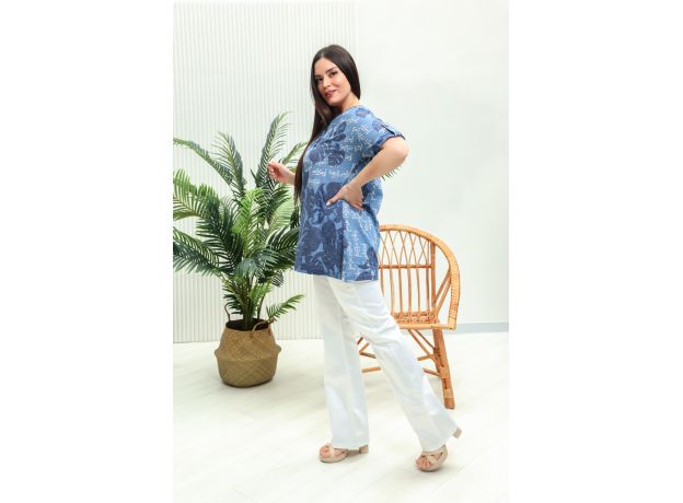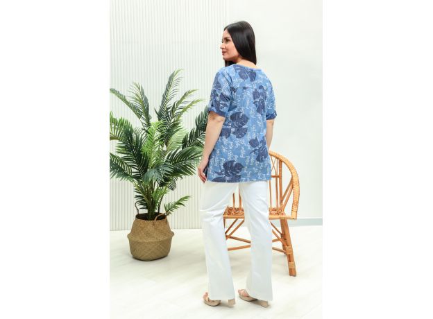 Туника прямая, свободная, с округлой горловиной, с удлиненной спинкой. Рукав короткий, с манжетом и хлястом с пуговицей. В верхней части полочки обработаны декоративные защипы. Спинка с кокеткой. В нижней части боковых швов расположены разрезы. Горловина обработана бейкой из основного полотна.