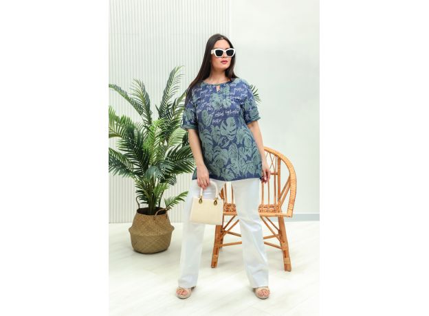 Туника прямая, свободная, с округлой горловиной, с удлиненной спинкой. Рукав короткий, с манжетом и хлястом с пуговицей. В верхней части полочки обработаны декоративные защипы. Спинка с кокеткой. В нижней части боковых швов расположены разрезы. Горловина обработана бейкой из основного полотна.
