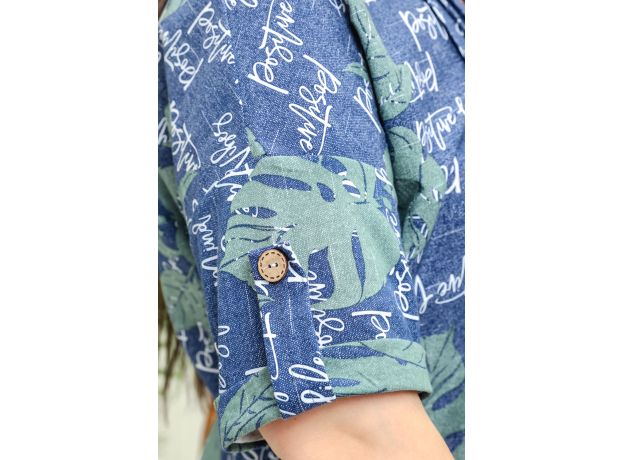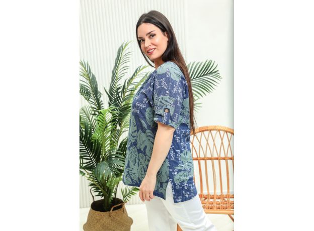 Туника прямая, свободная, с округлой горловиной, с удлиненной спинкой. Рукав короткий, с манжетом и хлястом с пуговицей. В верхней части полочки обработаны декоративные защипы. Спинка с кокеткой. В нижней части боковых швов расположены разрезы. Горловина обработана бейкой из основного полотна.