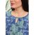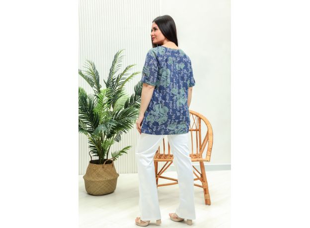 Туника прямая, свободная, с округлой горловиной, с удлиненной спинкой. Рукав короткий, с манжетом и хлястом с пуговицей. В верхней части полочки обработаны декоративные защипы. Спинка с кокеткой. В нижней части боковых швов расположены разрезы. Горловина обработана бейкой из основного полотна.