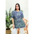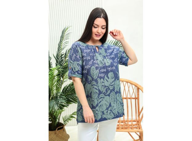 Туника прямая, свободная, с округлой горловиной, с удлиненной спинкой. Рукав короткий, с манжетом и хлястом с пуговицей. В верхней части полочки обработаны декоративные защипы. Спинка с кокеткой. В нижней части боковых швов расположены разрезы. Горловина обработана бейкой из основного полотна.