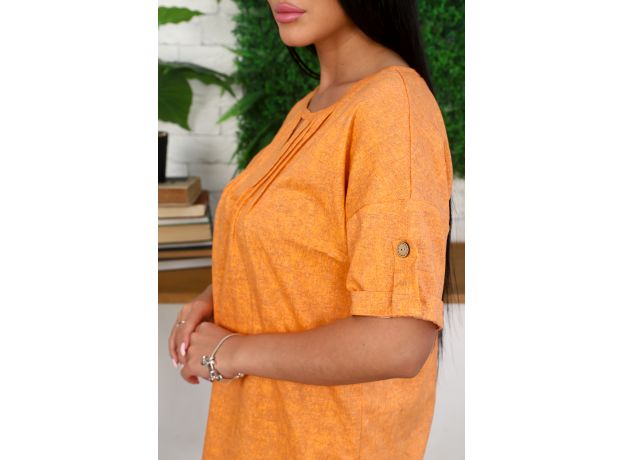 Туника прямая, свободная, с округлой горловиной, с удлиненной спинкой. Рукав короткий, с манжетом и хлястом с пуговицей. В верхней части полочки обработаны декоративные защипы. Спинка с кокеткой. В нижней части боковых швов расположены разрезы. Горловина обработана бейкой из основного полотна.