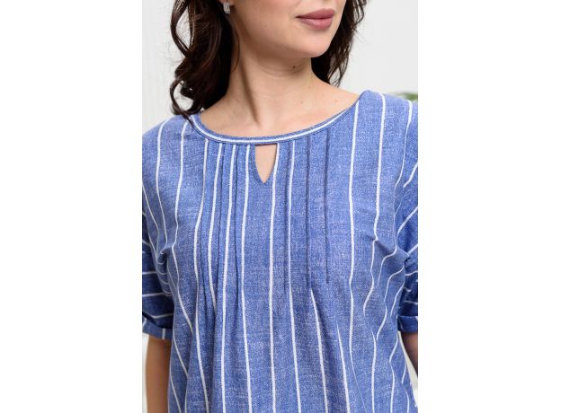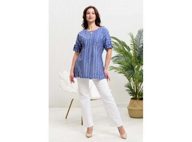 Туника прямая, свободная, с округлой горловиной, с удлиненной спинкой. Рукав короткий, с манжетом и хлястом с пуговицей. В верхней части полочки обработаны декоративные защипы. Спинка с кокеткой. В нижней части боковых швов расположены разрезы. Горловина обработана бейкой из основного полотна.