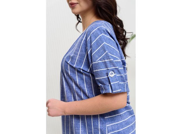 Туника прямая, свободная, с округлой горловиной, с удлиненной спинкой. Рукав короткий, с манжетом и хлястом с пуговицей. В верхней части полочки обработаны декоративные защипы. Спинка с кокеткой. В нижней части боковых швов расположены разрезы. Горловина обработана бейкой из основного полотна.