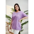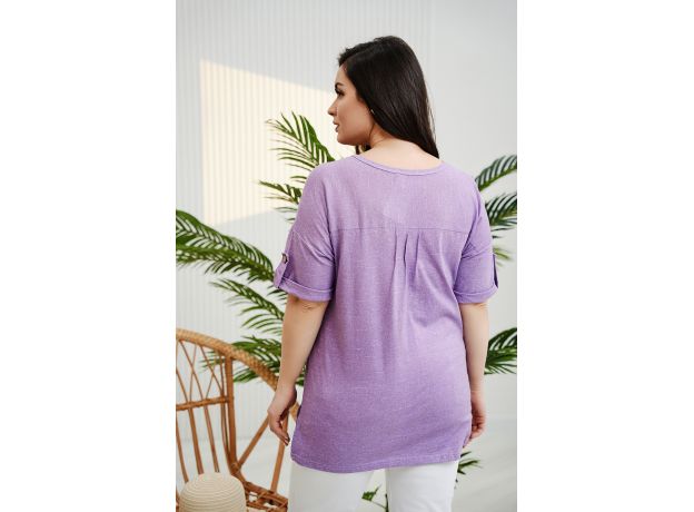 Туника прямая, свободная, с округлой горловиной, с удлиненной спинкой. Рукав короткий, с манжетом и хлястом с пуговицей. В верхней части полочки обработаны декоративные защипы. Спинка с кокеткой. В нижней части боковых швов расположены разрезы. Горловина обработана бейкой из основного полотна.