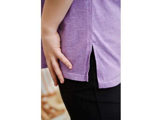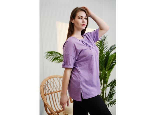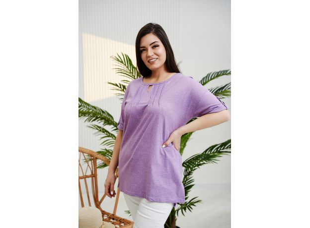 Туника прямая, свободная, с округлой горловиной, с удлиненной спинкой. Рукав короткий, с манжетом и хлястом с пуговицей. В верхней части полочки обработаны декоративные защипы. Спинка с кокеткой. В нижней части боковых швов расположены разрезы. Горловина обработана бейкой из основного полотна.