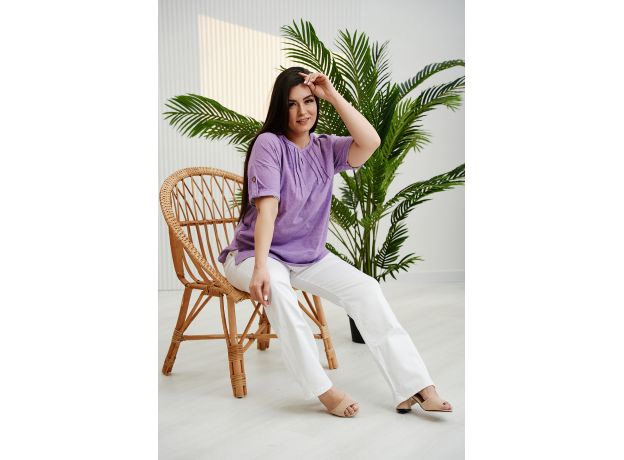 Туника прямая, свободная, с округлой горловиной, с удлиненной спинкой. Рукав короткий, с манжетом и хлястом с пуговицей. В верхней части полочки обработаны декоративные защипы. Спинка с кокеткой. В нижней части боковых швов расположены разрезы. Горловина обработана бейкой из основного полотна.